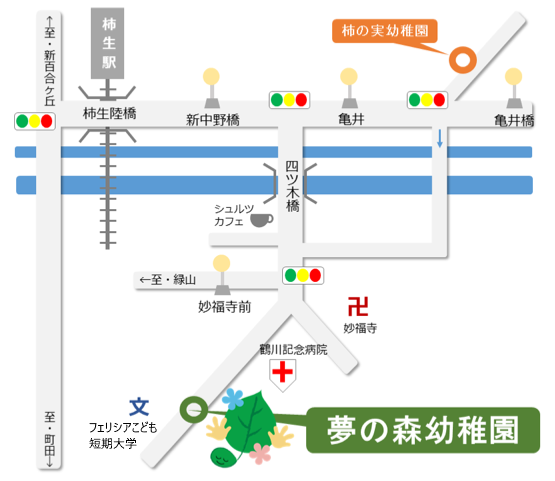 バス進行方向から後方へ40mほど戻り、突き当たり信号を右に進むと、Y字路が見えます。Y字路の右側の道を道なりに進むと、左手に夢の森幼稚園が見えます。(途中に病院が見えます。さらに先に進むと幼稚園です。)